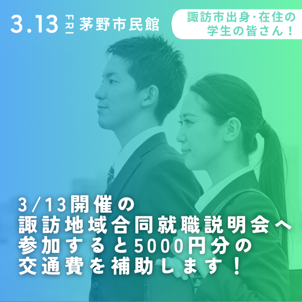 3月13日開催の諏訪地域合同就職説明会へご参加いただくと、来場までにかかった交通費の補助として、ギフトカード5,000円分を補助します。